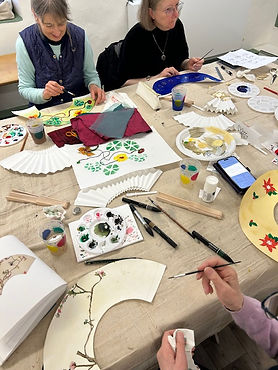 Day 2 was spent finishing the decoration on the sticks and guards before Sophia Mace demonstrated how to use the moulds to pleat their fan leaves. The students were then helped to pleat their own fan leaves before applying them to their sticks. The result was 8 beautiful fans and the students were really pleased with the how they looked. Two students liked their fans so much they were going to carry them to a dinner they were going to the following weekend.