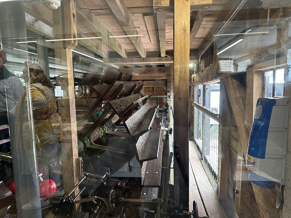 Fourteen members of the Fan Makers visited the Whitchurch Silk Mill on May 29th. The Georgian building houses a working silk-weaving mill / museum and we had a fascinating guided tour including the water wheel on the river Test which flows past the mill, the top level warp and weft floor where we saw how the patterns are built from the dyed silk and the weaving floor.