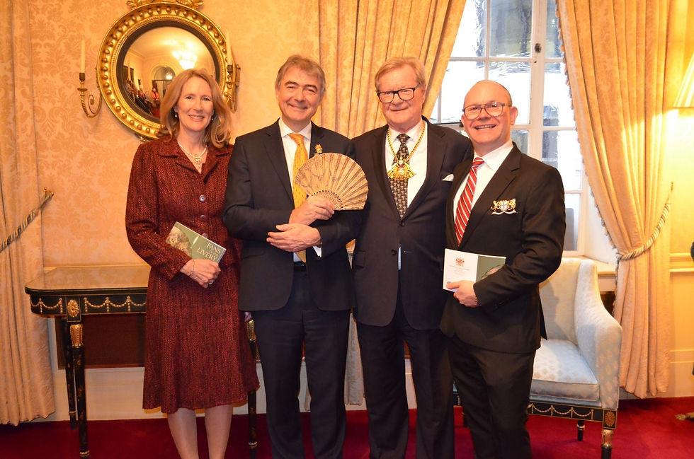A fan was presented to the Mayoral Consort Mr Gary Langley at Saddlers' Hall on Thursday 20th November by the Master, Antony Robson. Mr Langley was accompanied by the Sheriffs' Consorts Elspeth Hughes-Penney and Kevin Bradford, who received copies of the Fans of the Livery book. A fan was also presented to Mr Langley for the Lady Mayor, The Rt Hon Dame Susan Langley DBE, to honour her being the first to be styled Lady Mayor.